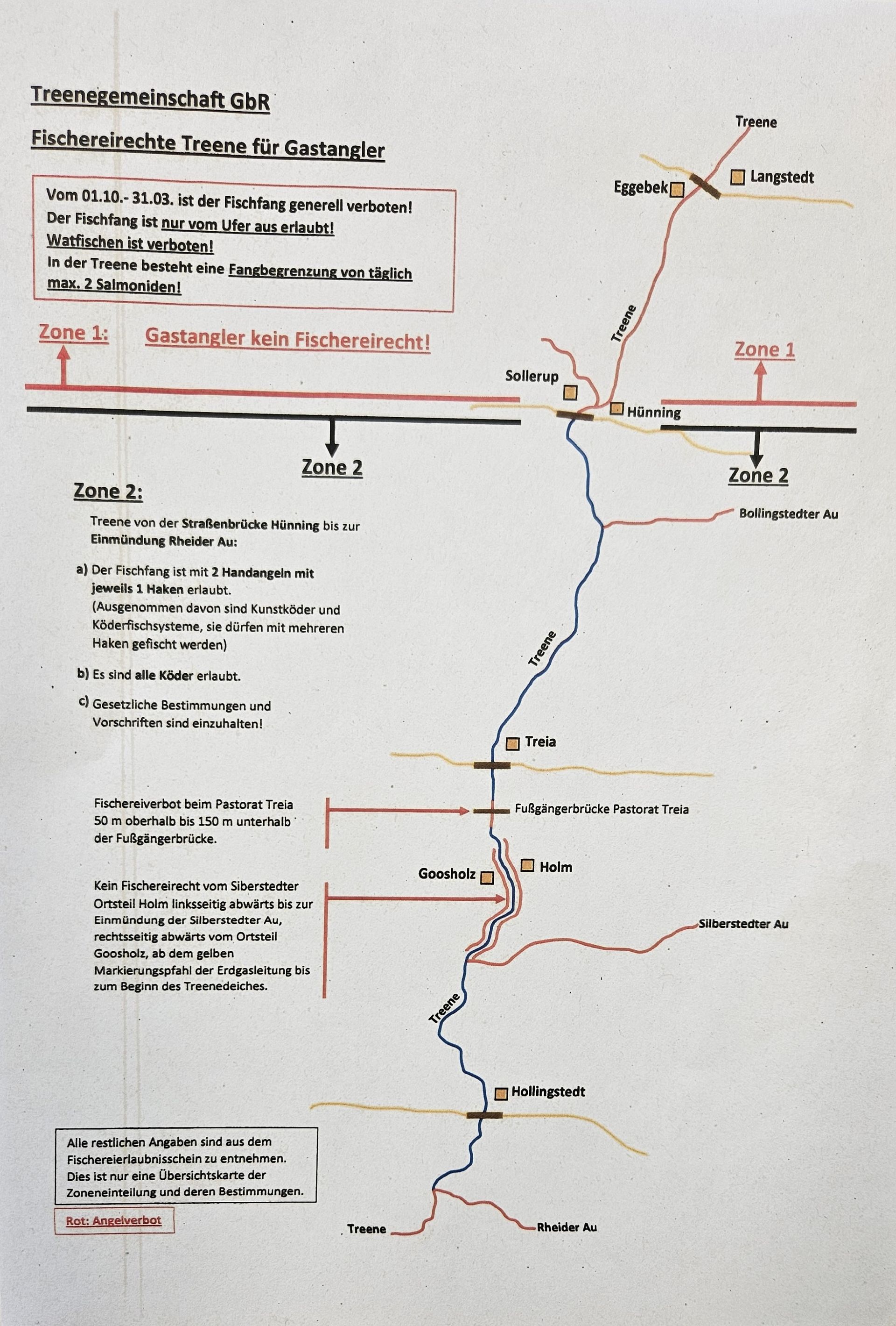 Für Gastangler freigegeben ist im nördlichen Bereich der Treene der Abschnitt von der Straßenbrücke bei Sollerup/Hünning bis zur Einmündung der Rheider aus südlich von Hollingstedt.