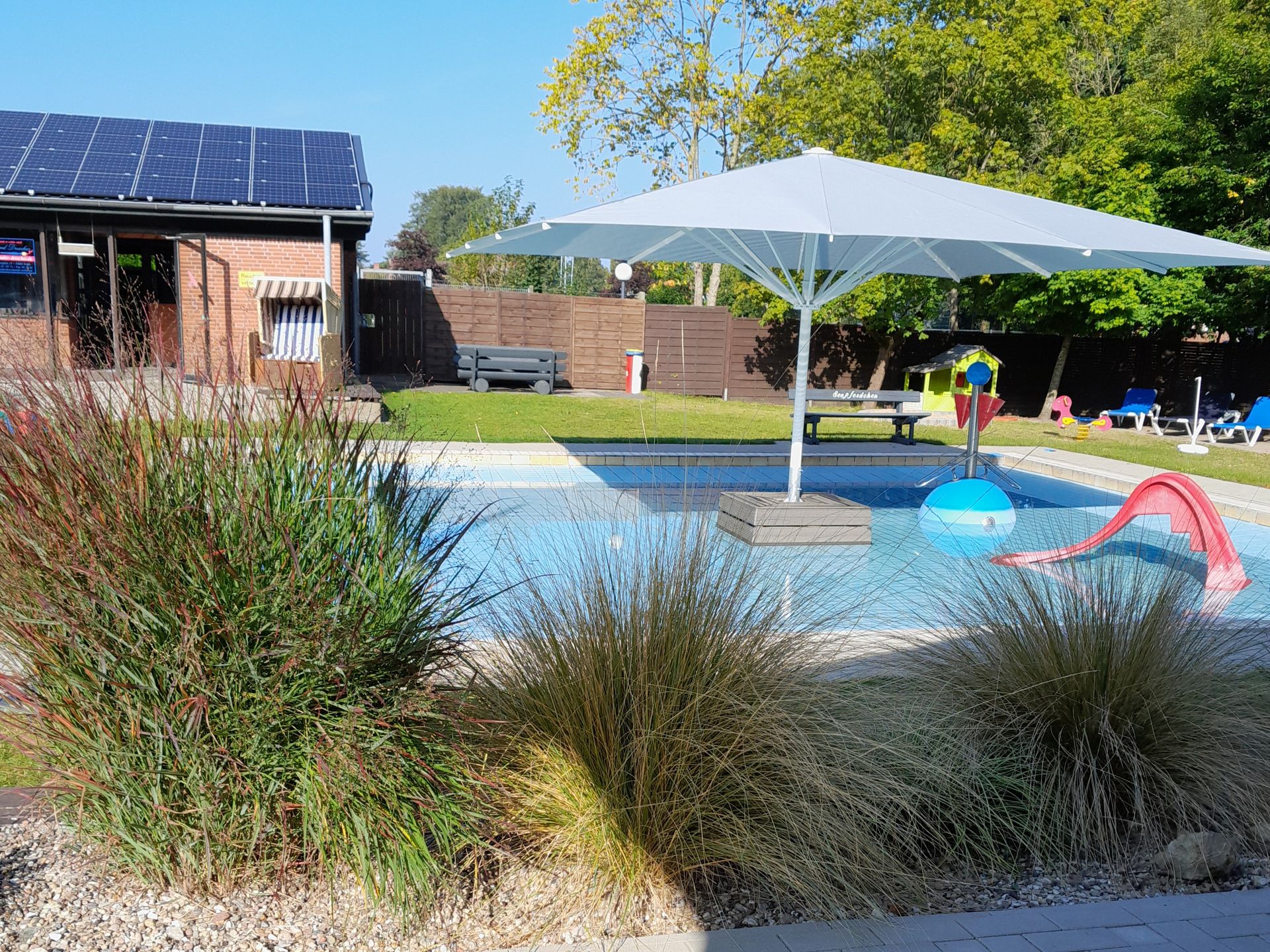 Rund ums Becken warten Strandkörbe, Liegen, Sonnenschirme, ein Trampolin, Tischtennis, Fußballtore, Schaukel, Tischkicker und sogar freies WLAN – ideal für einen ganzen Tag Urlaub im Freibad.