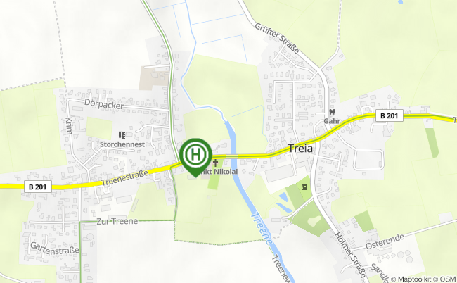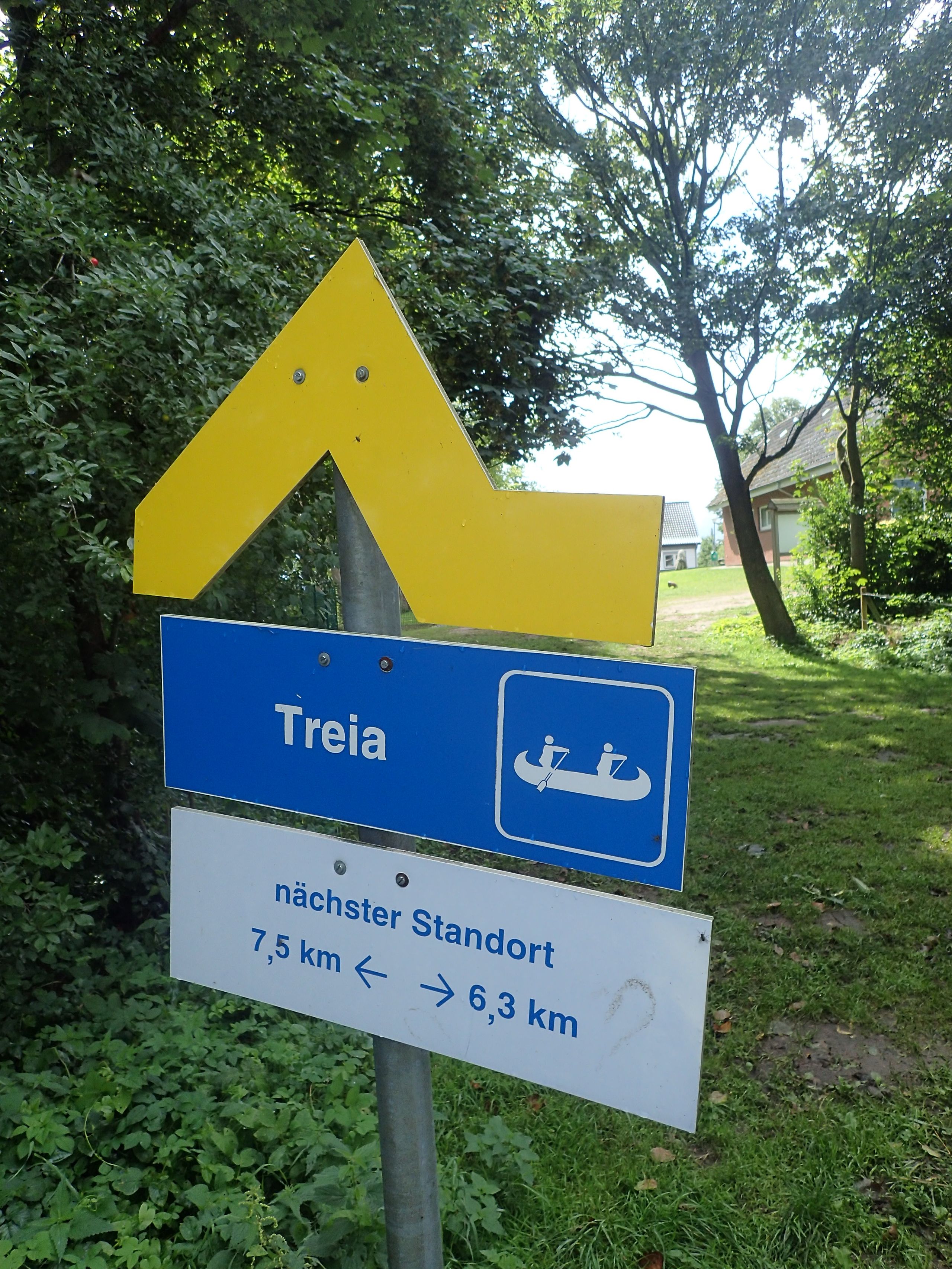 Die Staustufe an der Einsetzstelle Treia kann bei normalem Wasserstand befahren werden. Eine zweite Staustufe liegt etwa 500 Meter hinter der Brücke. Bei ausreichendem Wasserstand ist sie rechts der Dalben zu befahren, sodass die Strömung das Kanu nicht auf das Ufer drückt. Die dritte Staustufe liegt einen Kilometer flussabwärts. Sie sollte auf der linken Seite umtragen werden. Ab hier ist die Treene ein ruhiger Fluss, der gut zu befahren ist.