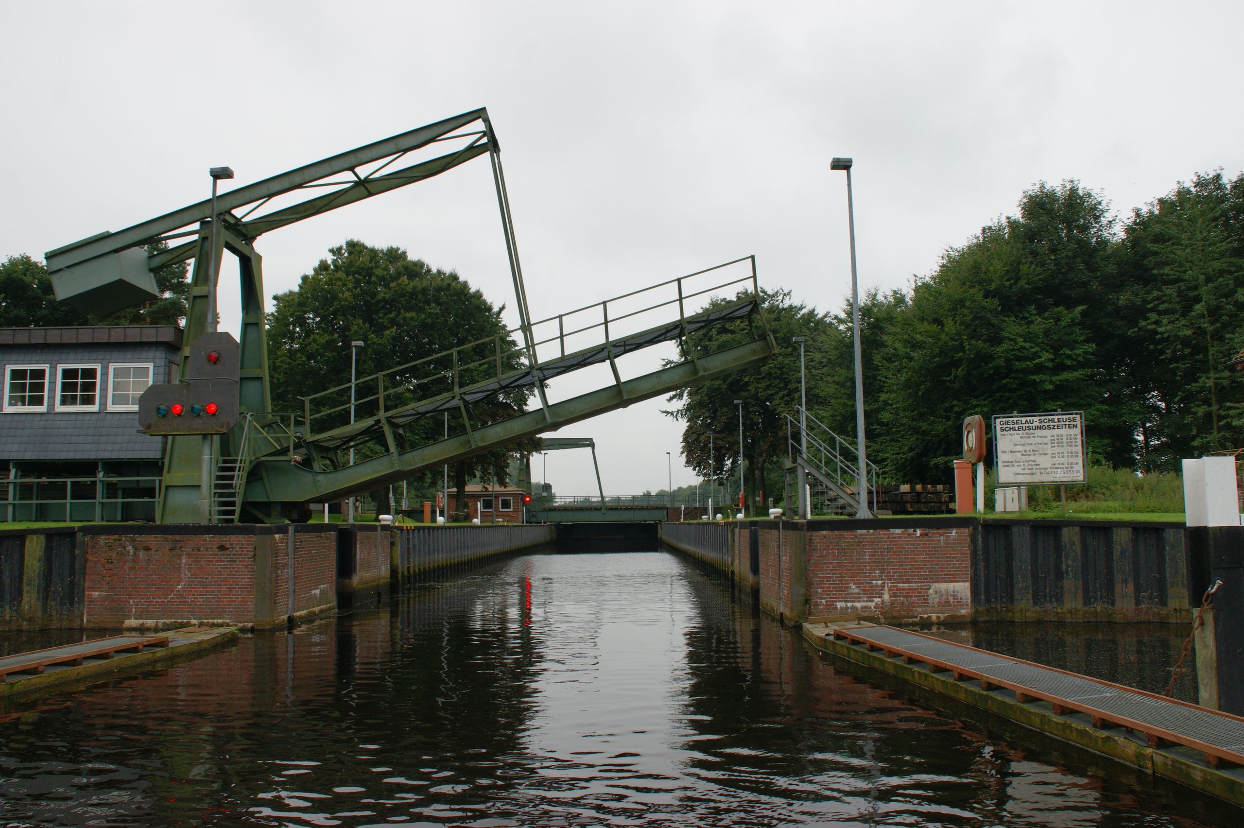 Die Gieselauschleuse, erbaut 1936/37, liegt bei Oldenbüttel und verbindet die Eider mit dem Nord-Ostsee-Kanal. Sie gleicht dort die unterschiedlichen Wasserstände zwischen Fluss und Kanal aus – eine Schleusentechnik, die bis heute funktioniert.